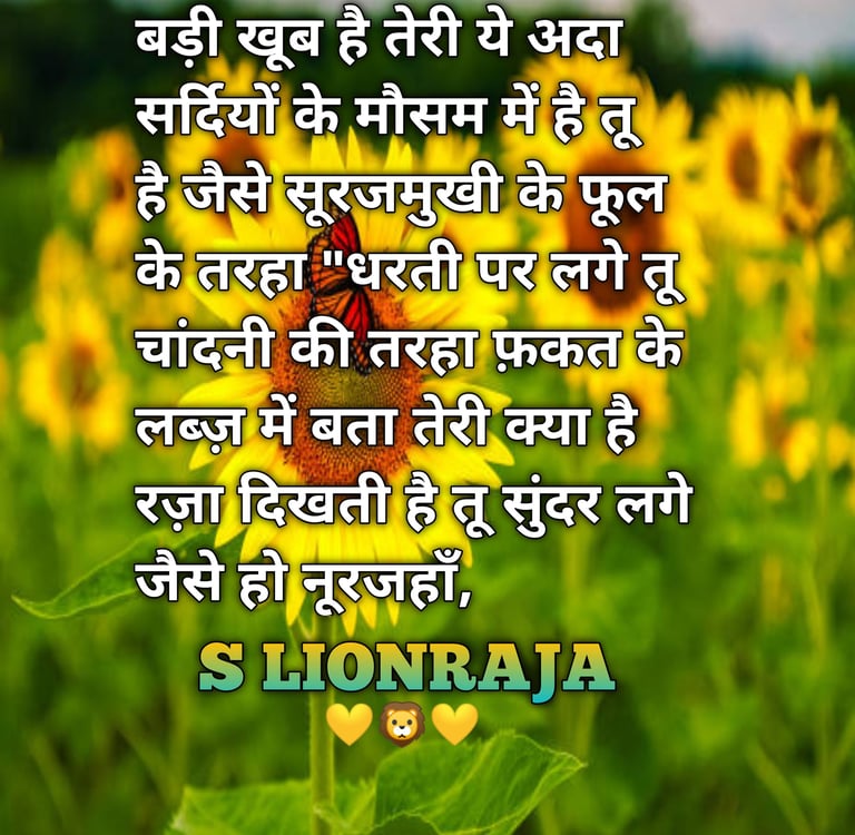 BADI KHOOB HAI TERI YE ADA SARDIYON KE MOSOM ME HAI TU HAI JASE SURAJMUKHI KE PHOOL KE TARAHA "DHARTI PAR LAGE TU CHANDANI KE TARAHA FAKAT KE LABZ MEIN BATA TERI KYA HAI RAZA DIKHATI HAI TU SUNDAR LAGE JAISE HO NOOR JAHAAN,