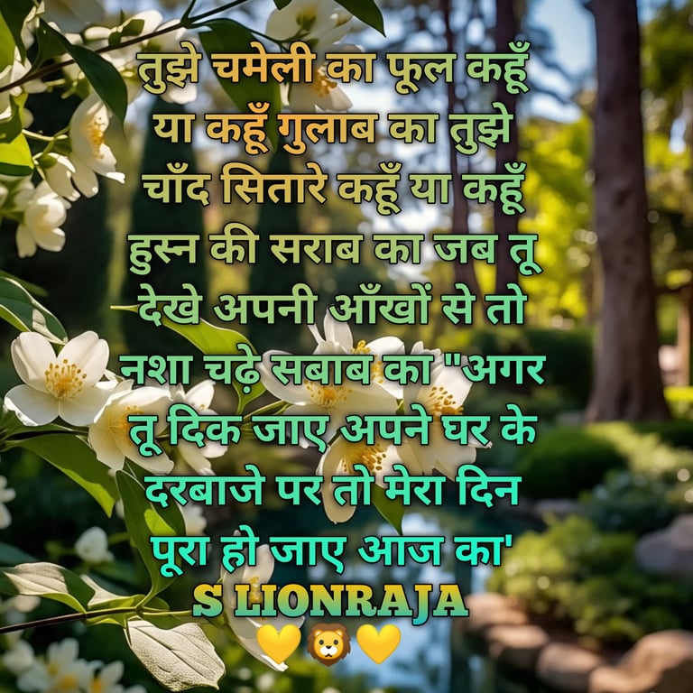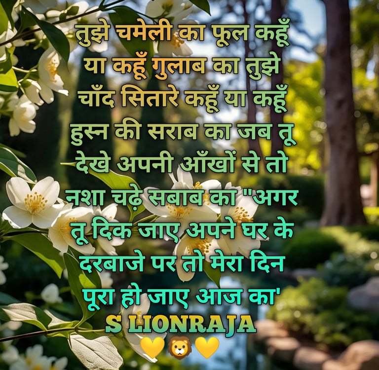 TUJHE CHAMELI KA PHOOL KAHOON YA GULAAB KA TUJHE CHAAND SITAARE KAHOON YA KAHOON HUSN KI SARAAB KA JAB TU DEKHE APANI ANKHON SE TO NASHA CHADHE SABAAB KA "AGER TU DIK JAE APANE GHAR KE DARBAAJE PAR TO MERA DIN PURA HO JAE AAJ KA'