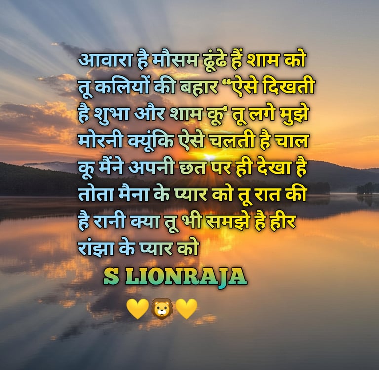 AAVAARA HAI MOOSAM DHOONDHE HAI SHAAM KO TU KALIYON KI BAHAAR "AISE DIKHATEE HAI SHUBHA AUR SHAAM KU' TU LAGE MUJHE MORANI KYOONKI AISE CHALATI HAI CHAAL KU MAINE APANEE CHHAT PAR HI DEKHA HAI TOTA MAINA KE PYAAR KO TU RAAT KI HAI RANI KYA TU BHI SAMAJHE HAI HEER RAANJHA KE PYAAR KOO