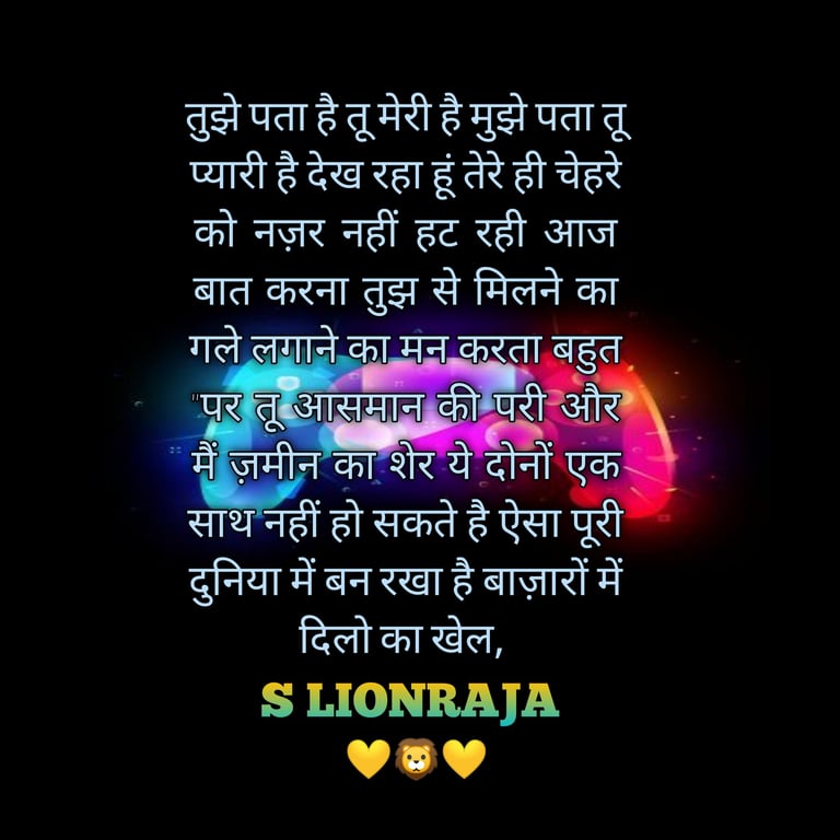 TUJHE PATA HAI TU MERI HAI MUJHE PATA TU PYAARI HAI DEKH RAHA HOON TERE HI CHEHARE KO NAZAR NAHI HAT RAHI AAJ BAAT KARANA TUJH SE MILANE KA GALE LAGANE KA MAN KARATA BAHUT "PAR TU AASMAAN KI PARI AUR MAIN ZAMEEN KA SHER YE DONON EK SAATH NAHI HO SAKATE HAI AISA POORI DUNIYA MEIN BAN RAKHA HAI BAAZAARON MEIN DILO KA KHEL,